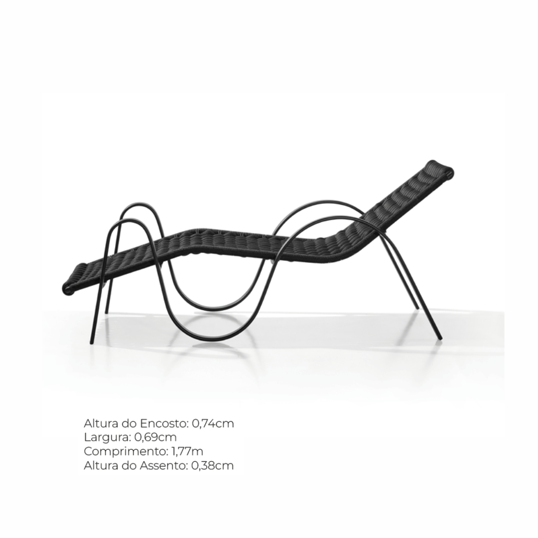 A sua estrutura é composta por linhas curvas e minimalistas em metal preto, que proporcionam estabilidade e um toque contemporâneo. O corpo da cadeira é revestido por uma trama robusta de corda náutica preta, oferecendo não só durabilidade, mas também um conforto flexível que se molda ao corpo.