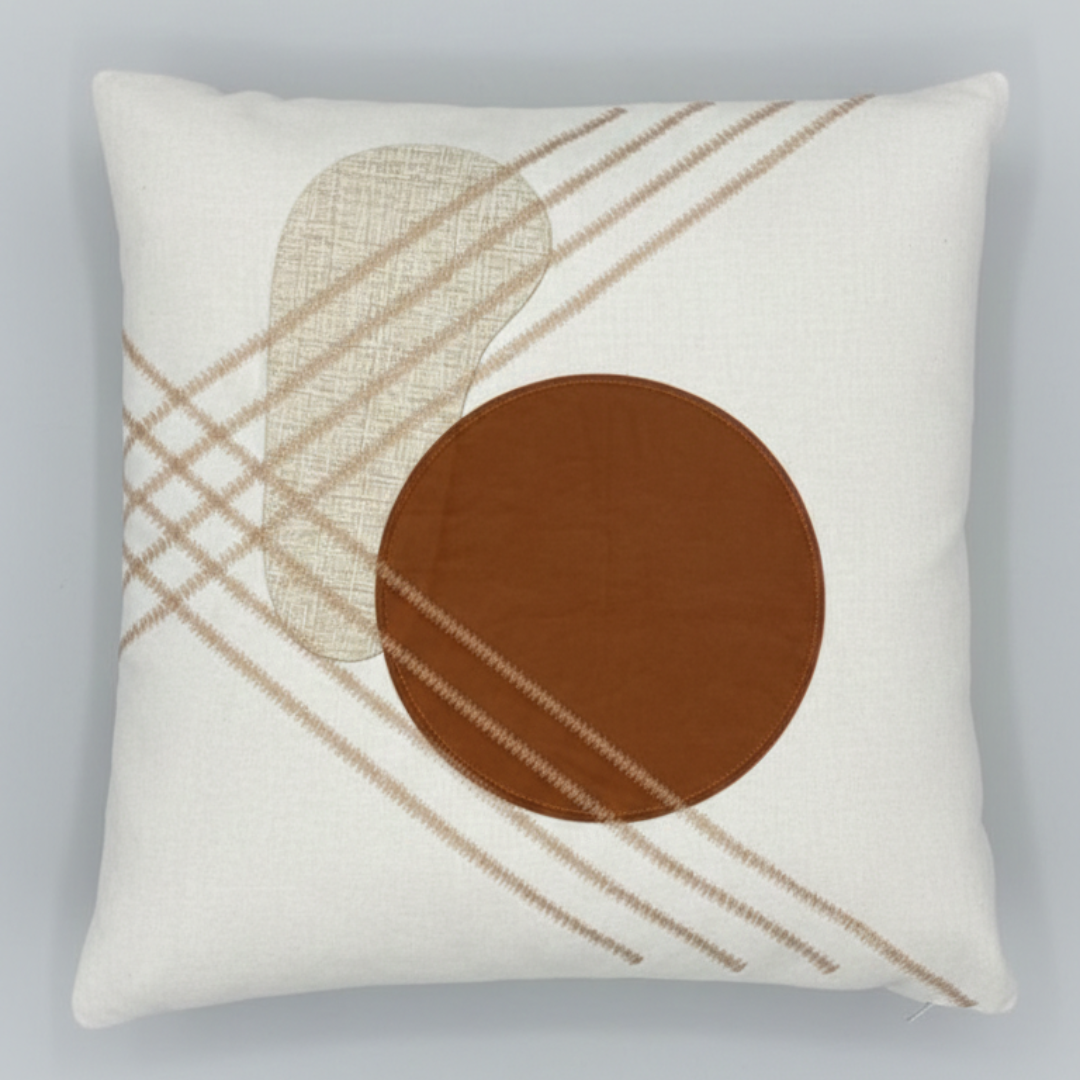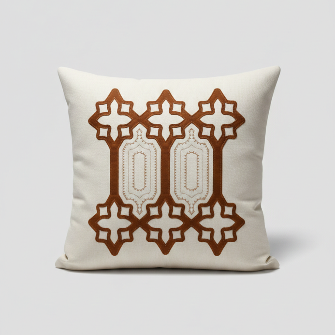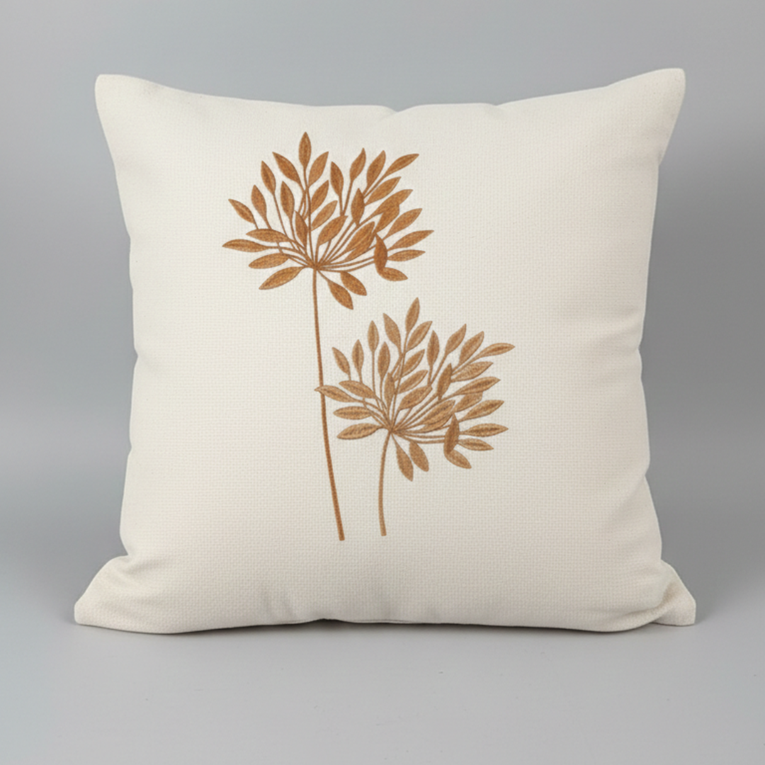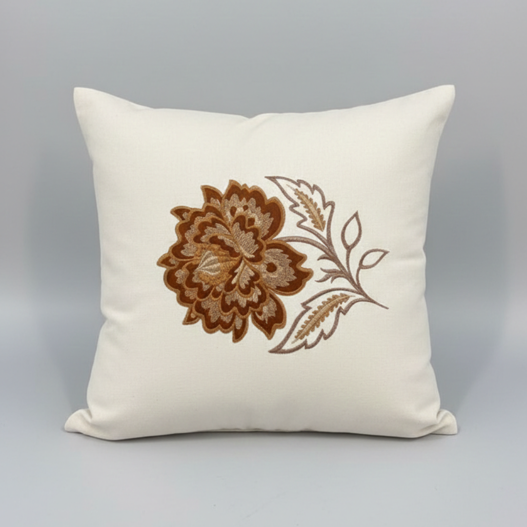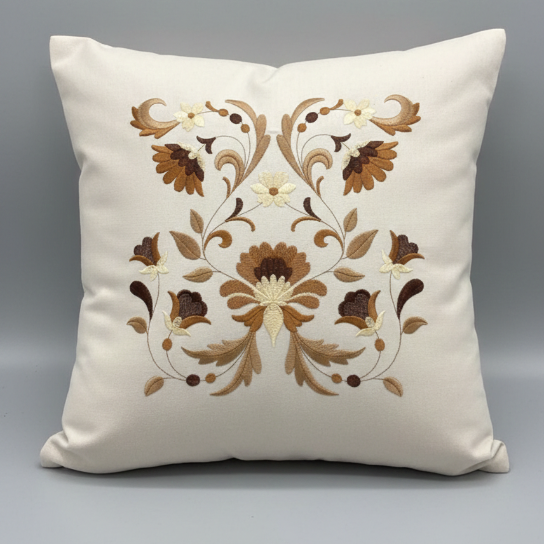 Adicione textura e personalidade à sua sala ou quarto. Esta peça é confeccionada em tecido de base clara com acabamento impecável, apresentando bordado com fios acetinados em degradê de marrom e dourado.