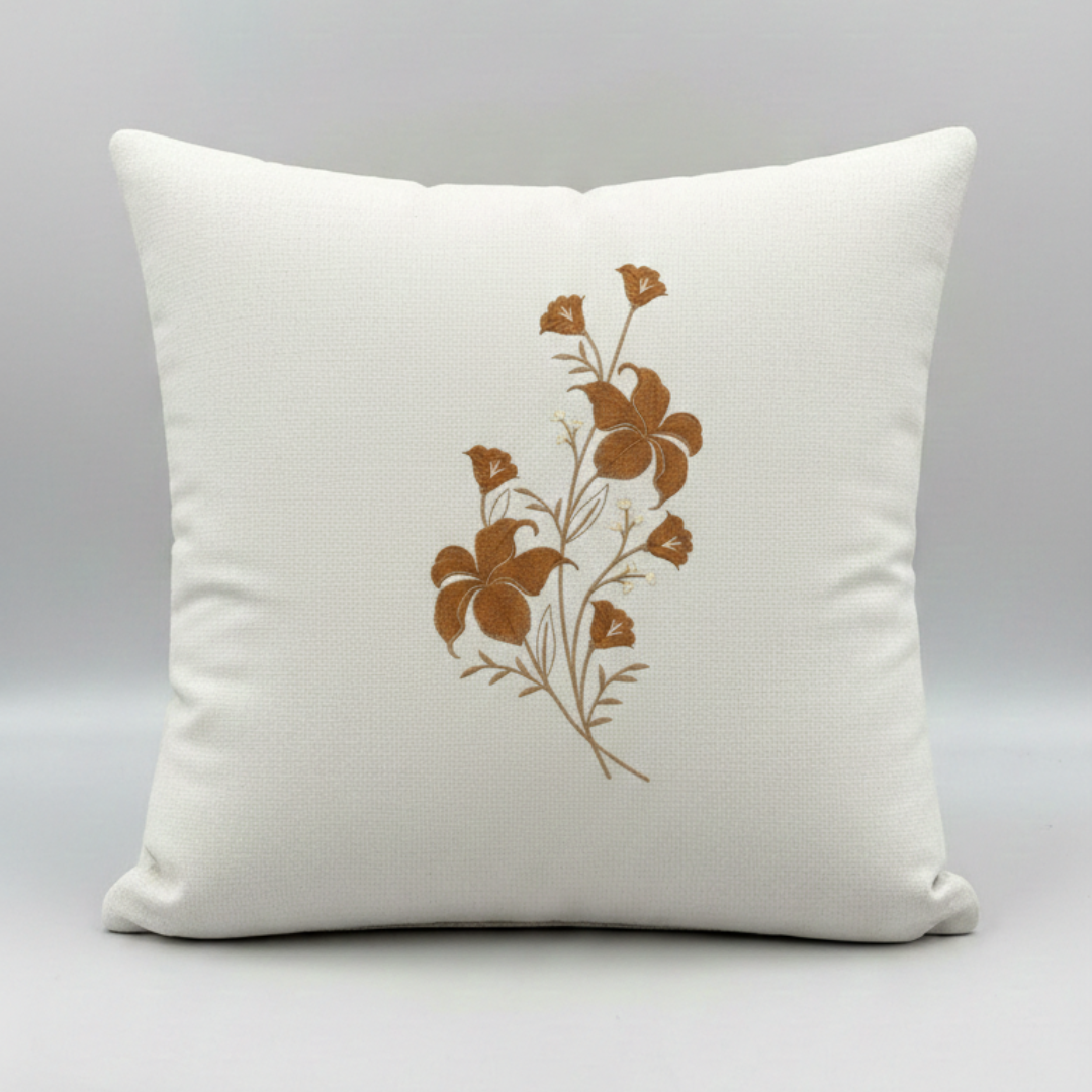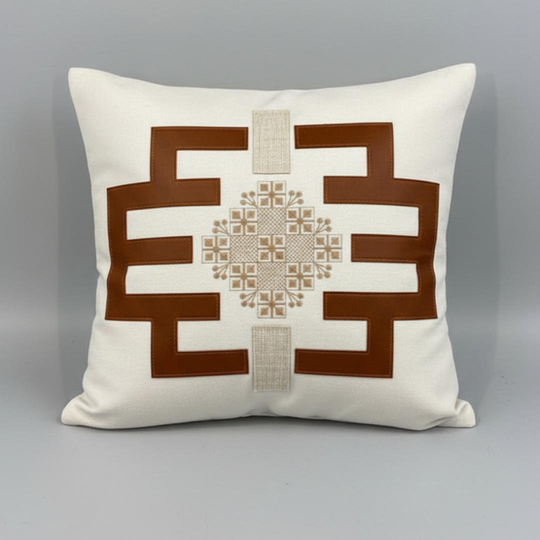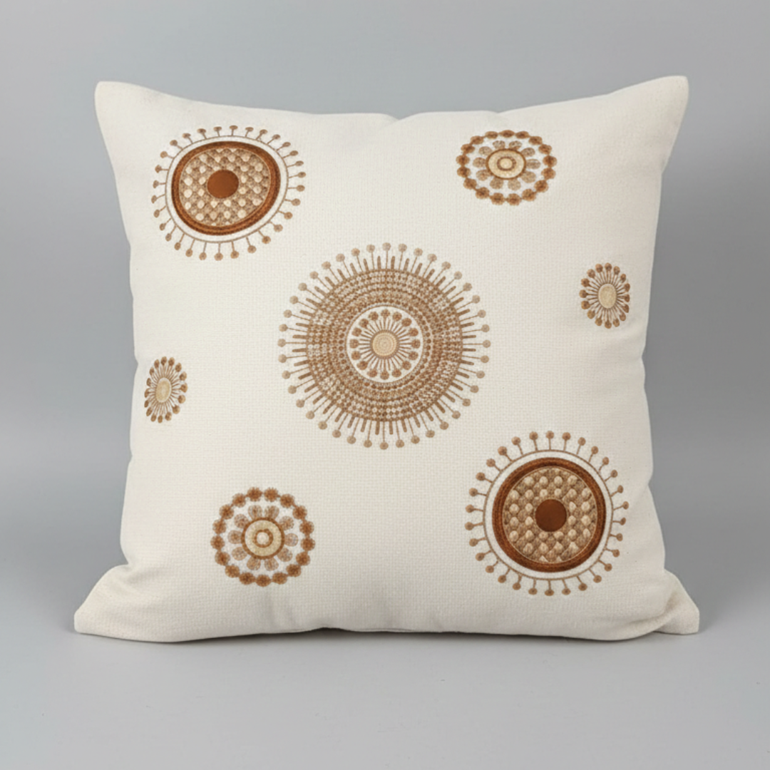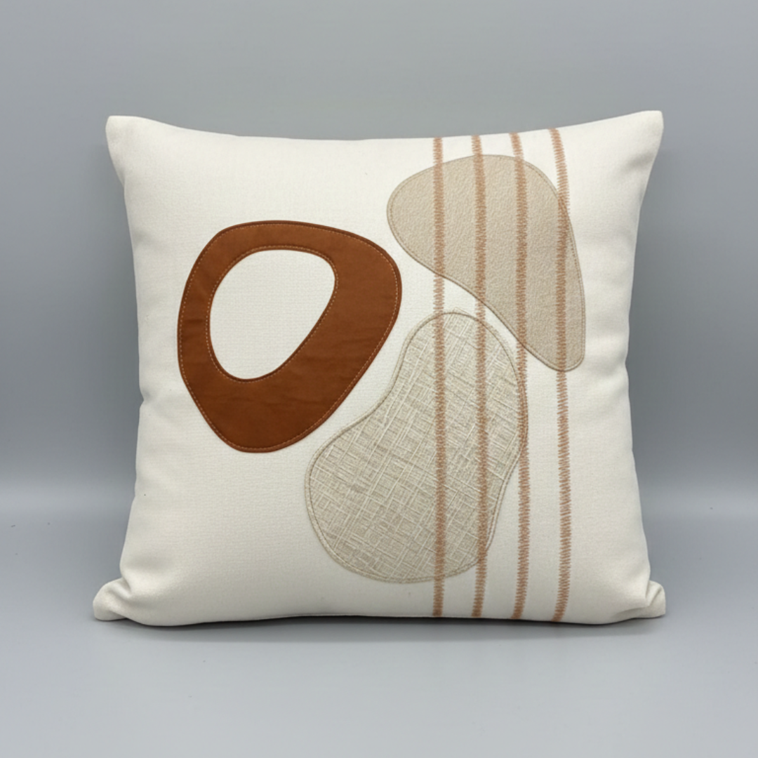 Adicione textura e personalidade à sua sala ou quarto. Esta peça é confeccionada em tecido de base clara com acabamento impecável, apresentando bordado com fios acetinados em degradê de marrom e dourado.