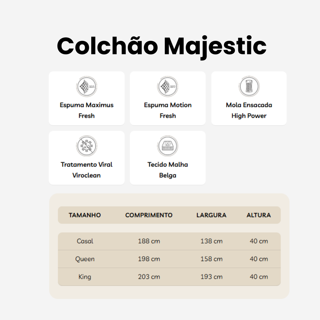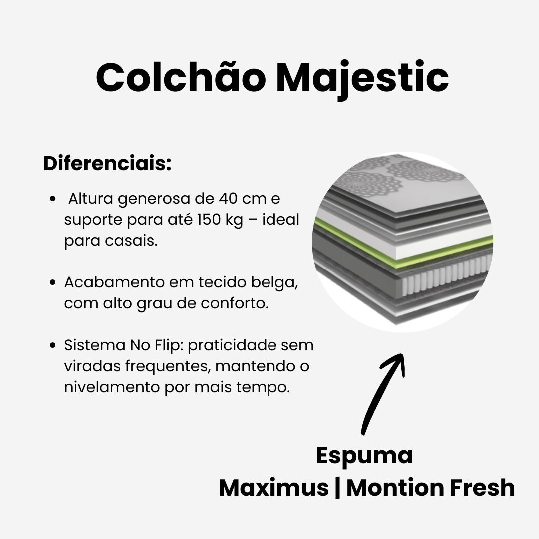 O Colchão Majestic honra seu nome ao oferecer luxo, tecnologia e um conforto incomparável. Seu robusto sistema de molas ensacadas High Power, com fios de aço mais resistentes, garante suporte firme e durabilidade, entregando equilíbrio perfeito entre resistência e suavidade.