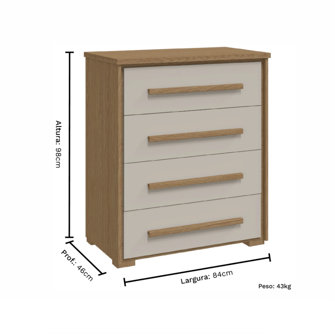 Praticidade e beleza adicional na composição do seu quarto. Essas são as vantagens da Cômoda Angra, nesta versão com 4 gavetas espaçosas e aliadas da organização.
