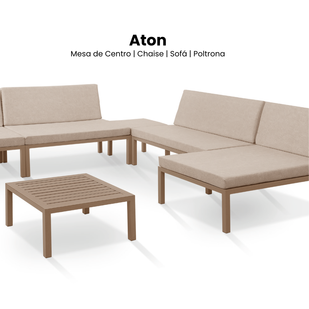 A linha Aton é a máxima expressão da versatilidade e do design modular para áreas externas. O conjunto é composto por Sofá, Poltrona e Chaise, que permitem diversas configurações para se adaptar perfeitamente ao seu espaço, além de uma Mesa de Centro com tampo ripado.