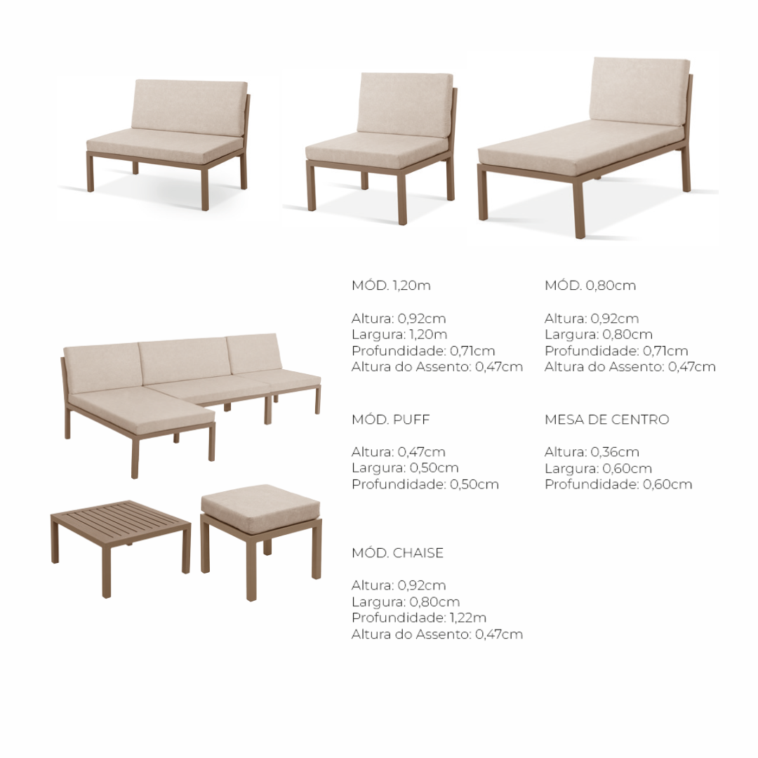 Com uma estrutura de alumínio em tom bronze e estofamento em tecido tecnológico de cor areia, o conjunto oferece um visual limpo, moderno e extremamente funcional para quem busca praticidade sem abrir mão do requinte.