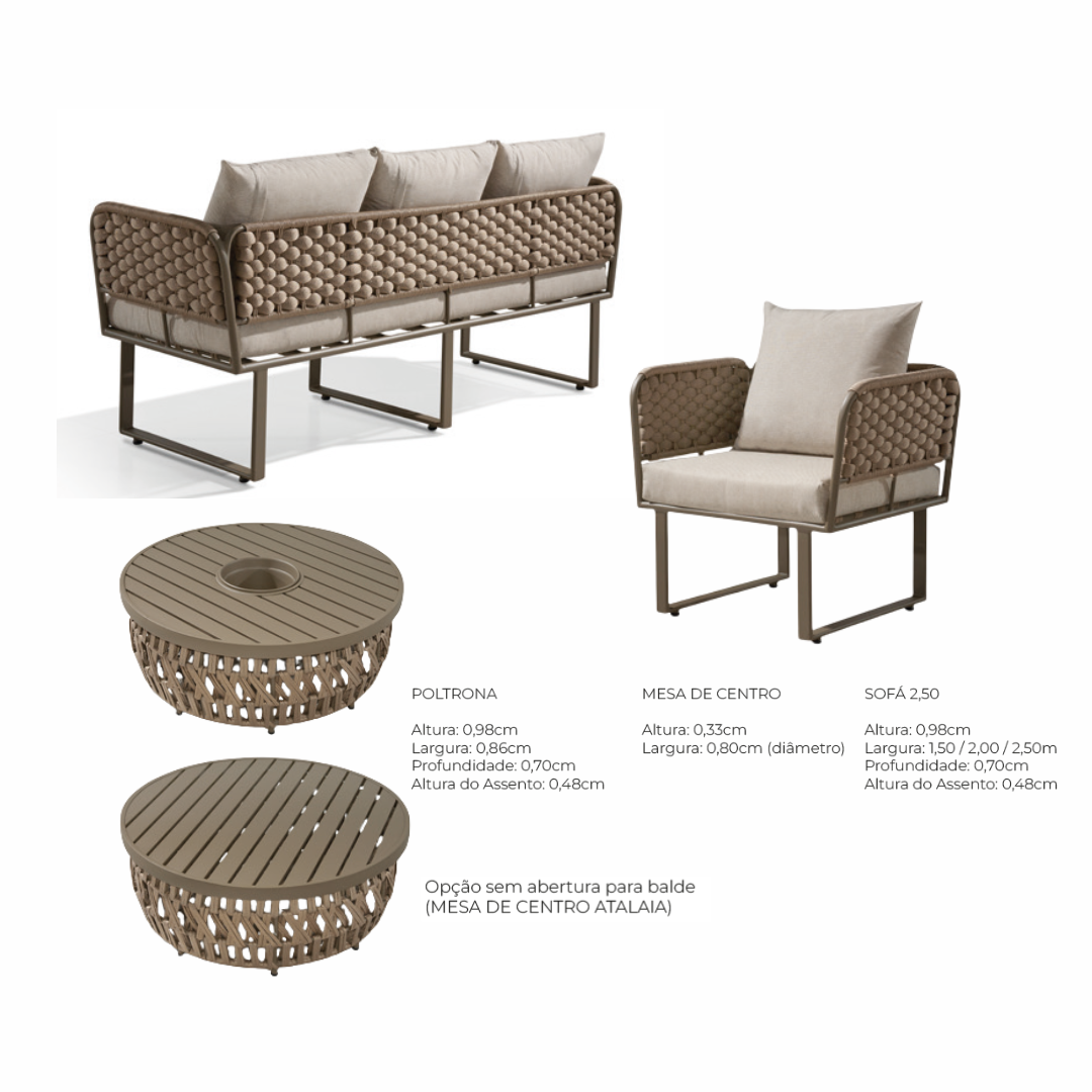 O conjunto é complementado pela Mesa de Centro Dallas, que possui tampo de alumínio ripado e uma base circular também revestida em corda náutica, mantendo a identidade visual sofisticada.