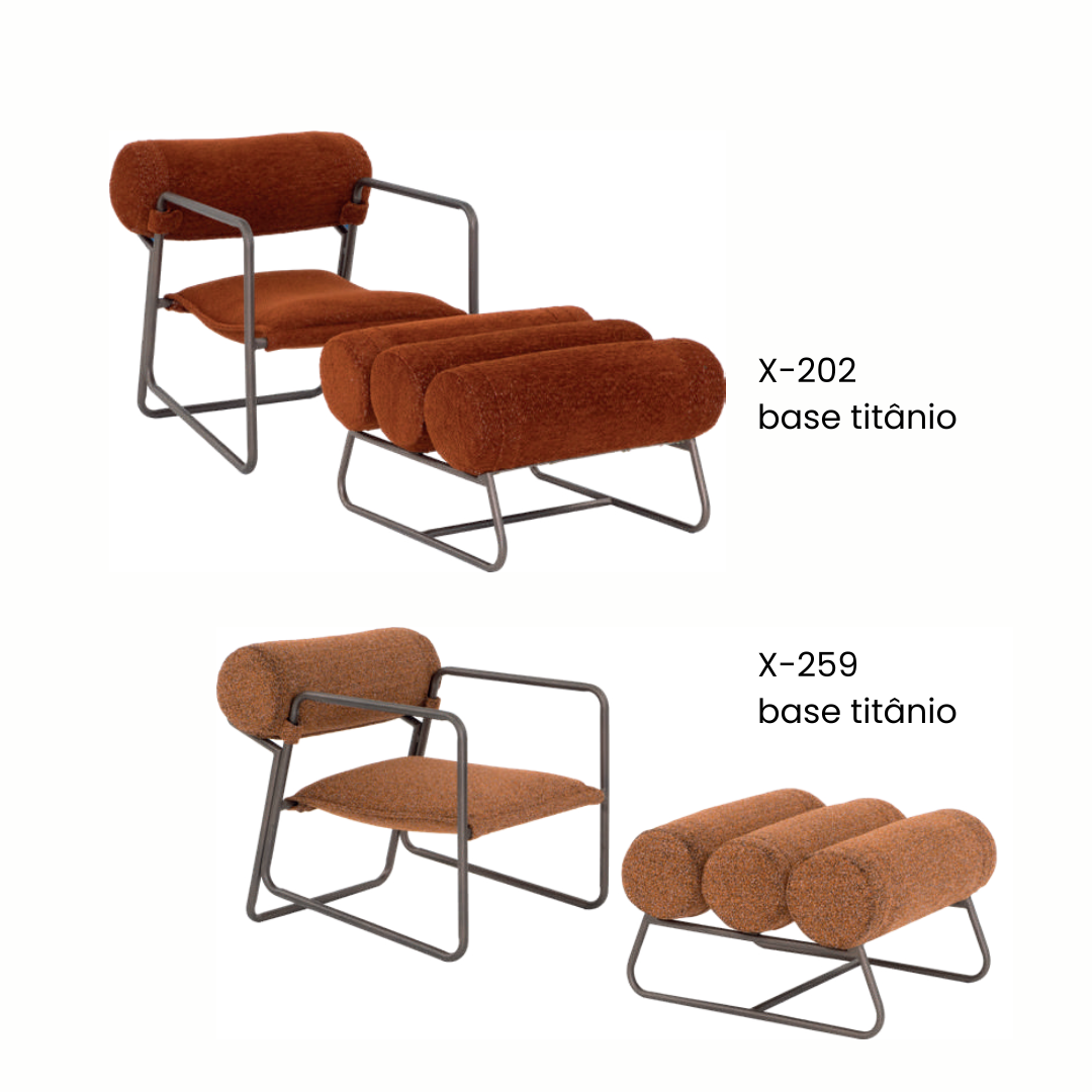 A coleção Dots se destaca pelo contraste marcante entre sua estrutura metálica e os elementos de estofamento cilíndricos. Enquanto as linhas retas da base conferem um ar moderno e arquitetônico, as almofadas em formato de “rolo” proporcionam uma estética lúdica e extremamente acolhedora.