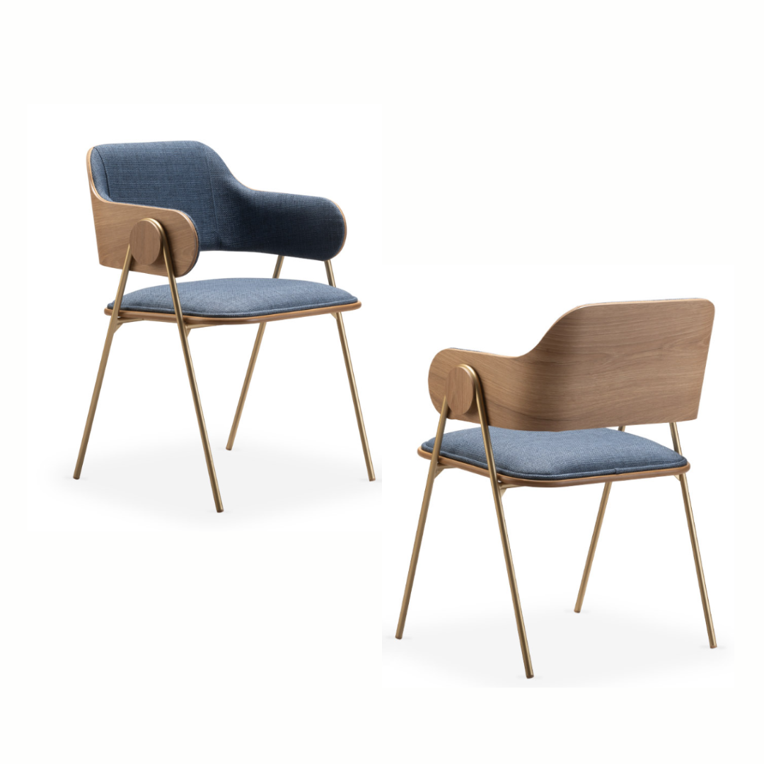 • Mix de Materiais: A combinação equilibrada entre o metal dos pés, a madeira do encosto e o estofamento em tecido tramado cria um contraste sensorial riquíssimo.